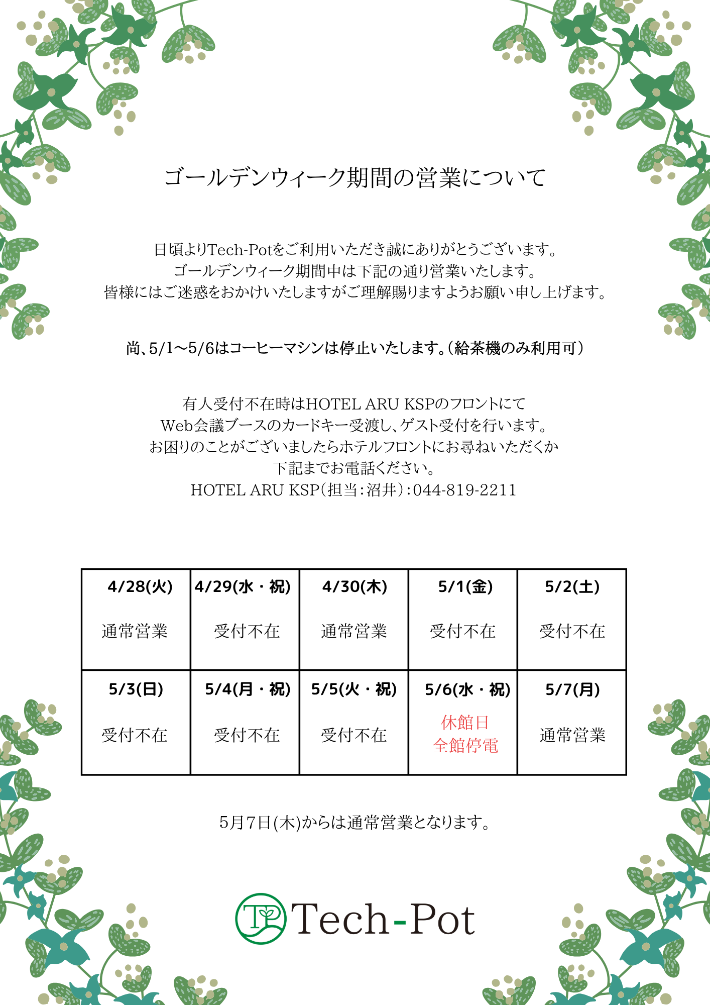 Tech-Potのゴールデンウィーク期間中の営業をお知らせいたします。