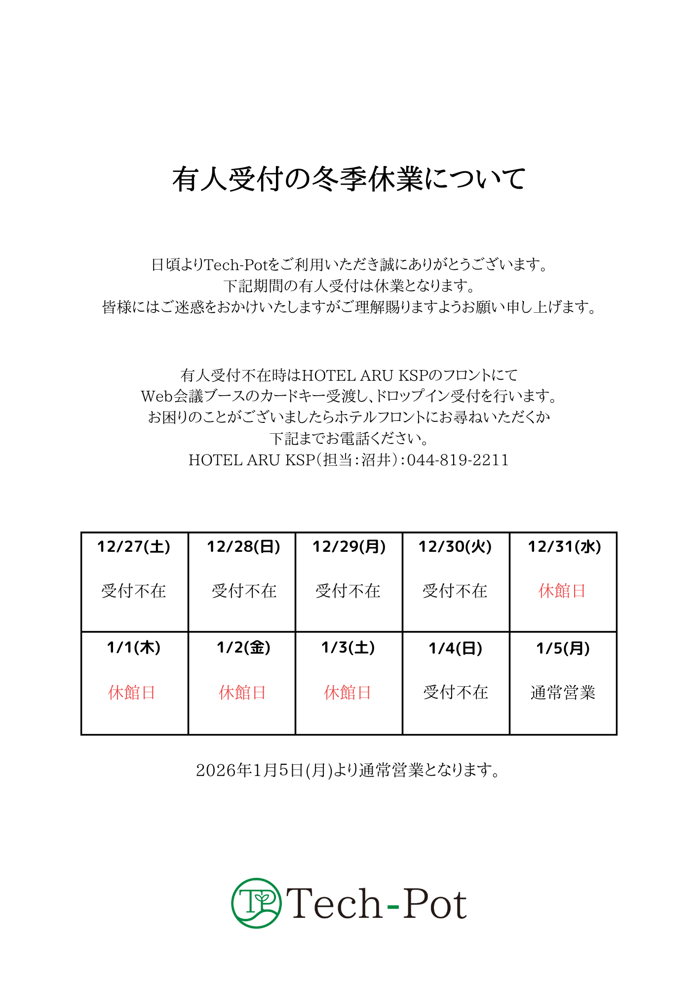 Tech-Potの年末年始営業は上記の通りとさせていただきます。
